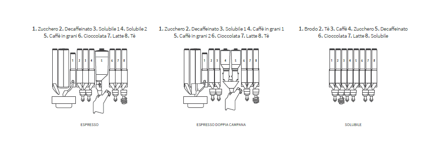Ampia offerta . Si possono configurare fino a 5 famiglie di prodotti, ciascuna delle quali può essere programmata fino a 6 selezioni di singoli articoli o 6 selezioni di menu composti da una bevanda più uno snack, quando la macchina è collegata in master/slave.